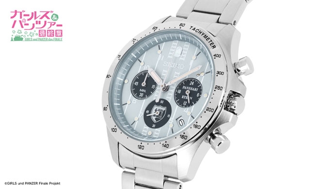 ダイヤルの中央には、戦車の轍、12時位置にはミカが愛用するチューリップハットを、3時位置のサブダイヤルにはフィンランド語で『戦車前進』を意味するテキストを、6時位置のサブダイヤルには継続高校の校章をデザイン。